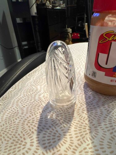 This item is a crystalline glass shaker, standing approximately 4 to 5 inches tall, featuring a distinct bullet or dome-shaped silhouette. It is constructed from a heavy transparent glass, likely soda-lime or lead-free crystal, featuring a common early-to-mid 20th-century pressed glass pattern. The design consists of vertical fluting around the base transitioning into a stylized fan or feather-like geometric motif that decorates the rounded crown. The top of the dome features a singular or small cluster of perforated holes for dispensing contents such as salt, pepper, or powdered sugar. The base appears to be a separate threaded or friction-fit component, though the bottom plate is not fully visible, suggesting it may have a plastic or metal stopper. The glass shows good clarity with no immediate evidence of 'sick' or cloudy glass, but there are visible minor surface scratches and potential flea-bite chips along the sharp edges of the pressed pattern, consistent with household use. The craftsmanship reflects mass-produced American Brilliant Style era (ABP) reproductions often found in the 1940s-1960s. There are no clearly visible maker's marks or signatures from this angle, which is typical for utility tableware of this period.