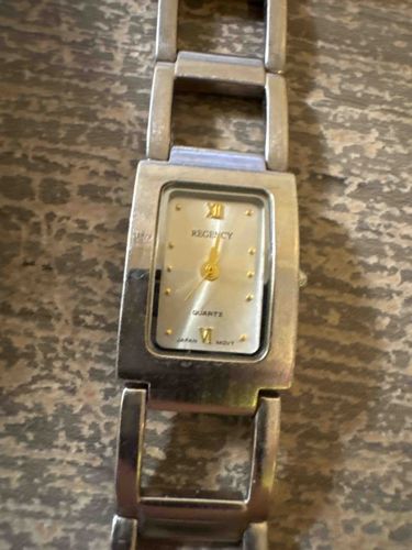 This is a vintage-style women's dress watch from the brand Regency. The timepiece features a rectangular stainless steel or silver-toned base metal case with a minimalist design aesthetic. The dial is light silver or champagne in color, featuring gold-toned dot hour markers and Roman numerals at the 12 and 6 o'clock positions. The hands are gold-toned, including the hour, minute, and second hands, providing a mixed-metal contrast against the silver-toned case. The dial is printed with 'REGENCY' at the top and 'QUARTZ' above the 6, with 'JAPAN MOVT' indicated at the very bottom, signifying a Japanese quartz movement. The watch is integrated into an open-link ladder style bracelet, which appears to be constructed of polished metal links. Regarding condition, the watch shows signs of moderate wear consistent with age, including surface scratches, scuffs on the bezel, and minor pitting on the metal surfaces. There is some visible tarnish or patina, particularly along the edges of the case and within the links. The crystal appears relatively clear but likely has micro-abrasions from regular use. Based on the styling and brand, this item likely dates from the 1990s or early 2000s, reflecting a mass-market fashion jewelry quality rather than luxury horology.