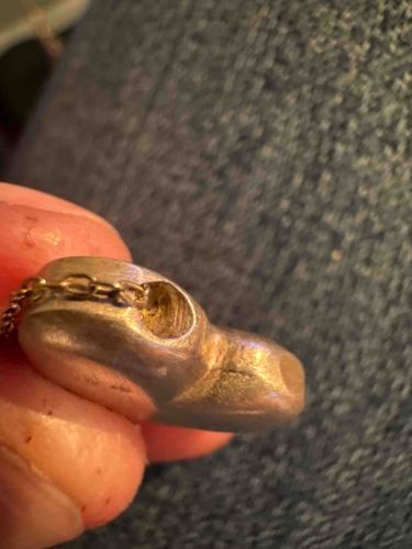 This item is a vintage-style 'puffy' heart pendant, constructed from two halves of stamped metal joined together to create a three-dimensional, hollow core. The piece is crafted from a silver-toned metal, likely sterling silver or a silver-plated alloy, showing a soft, warm patina consistent with age. It features a slide-through bail design where the thin curb-style chain passes directly through a recessed circular opening at the top of the heart, rather than using a traditional hanging loop. This integrated bail design gives the pendant a modern, minimalist aesthetic. The heart has rounded, bulbous contours and exhibits minor surface scratches, tiny pits, and general wear typical of a pre-owned vintage accessory. Darkening or oxidation is visible within the chain cavity and along the seam where the two halves meet, highlighting its construction. The scale is small, fitting comfortably between two fingers, suggesting it was intended as a delicate neck pendant or a charm. While no hallmarks are immediately visible in this specific view, the luster and tarnish patterns are characteristic of mid-20th-century costume or fine silver jewelry. The overall craftsmanship is commercial yet sturdy, representing a timeless romantic motif popular in jewelry from the 1970s and 1980s.