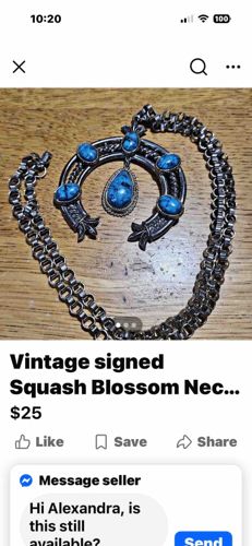 This item is a vintage-style Native American inspired necklace featuring a prominent Naja (crescent) pendant. The necklace is constructed from a double-strand link chain, likely made of silver-toned metal or low-grade silver, exhibiting a dark oxidization or patina throughout the recessed areas. The Naja pendant is highly ornate, featuring five oval-shaped faux or stabilized turquoise cabochons with significant matrix veining in blue and black tones. One larger pear-shaped turquoise stone hangs as a central drop within the crescent. The metalwork on the pendant includes twisted rope borders, decorative stampings, and stylized blossom tips at the ends of the crescent. Construction appears to be cast metal rather than high-end hand-fabricated silversmithing. There is visible wear consistent with age, including surface scratches and tarnish. While the seller listing mentions it is 'signed,' the specific maker's mark is not visible in this photograph. Based on the aesthetic and materials, it likely dates to the mid-to-late 20th century, mimicking the classic Navajo Squash Blossom style.