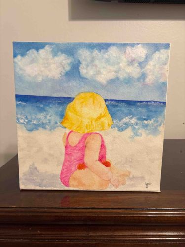 This item is an original watercolor painting on a square gallery-wrapped canvas. The composition features a young child seated on a beach, viewed from the back, looking out toward the ocean. The child wears a bright yellow sun hat and a pink one-piece swimsuit adorned with small orange pom-pom accents at the hips. The background consists of a blue sea with white foaming waves meeting a white sandy shore, beneath a pale blue sky filled with puffy white clouds. The artwork employs an impressionistic style with soft, blended watercolor transitions and delicate stippling to denote texture in the clouds and sand. The piece is signed with a small black ink monogram or initials in the lower right corner. As a watercolor on gallery-wrapped canvas, the medium is somewhat atypical, requiring a treated canvas ground to accept the water-based pigments. The craftsmanship shows a confident use of color theory, particularly in the contrast between the primary yellow hat and the secondary background tones. The condition appears excellent with vibrant colors and no visible fading, foxing, or structural issues to the canvas corners. The item is contemporary in age and style, likely created within the last decade, and its presentation on a 1.5 to 2-inch deep stretcher bar allows for frameless display.