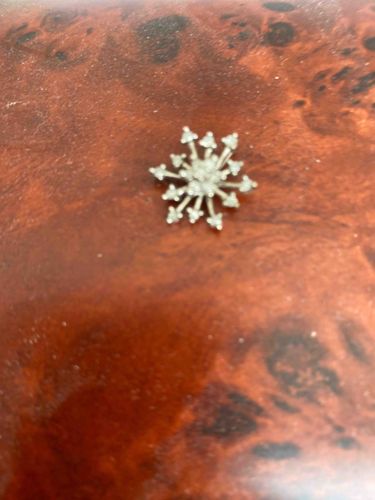 This item is a small, delicate starburst or snowflake-shaped jewelry piece, likely a pendant or a lapel pin, crafted from a white metal. The metal appears to be either 14k white gold, platinum, or high-quality sterling silver based on the high-sheen finish. The design features a central cluster of small, round-cut gemstones—most likely diamonds—surrounded by radiating 'arms' of varying lengths. Each arm terminates in a small setting containing another round-cut stone. There are approximately twelve radiating points in total, creating a symmetrical, celestial aesthetic typical of mid-20s mid-century modern or 'atomic' era jewelry styles. The stones appear to be prong-set or grain-set, showing fine craftsmanship consistent with vintage fine jewelry. While the image is slightly out of focus, the metalwork seems intact with no obvious missing stones or broken prongs. The piece sits atop a polished burl wood surface, which provides a sense of scale, suggesting the item is approximately 1.5 to 2 centimeters in diameter. There are no visible maker's marks or hallmarks from this angle, though they would typically be located on the reverse side or the bale. The overall condition appears excellent with a bright patina and no significant signs of oxidation or wear.