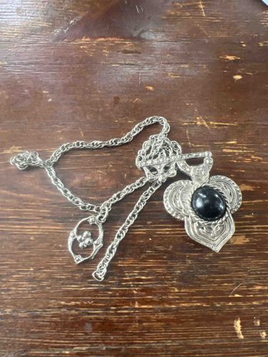 This is a vintage silver-tone necklace featuring a large, ornate pendant and a chunky toggle-style chain. The pendant is designed with a stylized trifurcated or fleur-de-lis silhouette, measuring approximately 2.5 inches in height. It is constructed from a cast silver-colored metal alloy with a bright, slightly antiqued finish. At its center is a large, oval, high-domed black cabochon, likely made of acrylic or glass, held within a twisted-rope bezel. The metalwork surrounding the stone displays intricate concentric scalloped patterns and textural ribbing. The pendant is suspended by a decorative bale featuring small inset colorless rhinestones. The necklace utilizes a thick rope or curb style chain that terminates in a front-facing toggle clasp. The toggle bar itself is also accented with small clear crystals. Additionally, a secondary decorative charm or openwork link hangs from the chain, featuring a quatrefoil flower motif. Based on the construction style, mass-produced quality, and design aesthetic, this piece likely dates from the late 20th century (1980s-1990s) and identifies as costume jewelry. The overall condition appears good with minor surface scratches on the black cabochon and some slight dulness to the metal finish, which is consistent with age and use.