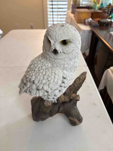 This is a detailed decorative sculpture depicting a Snowy Owl (Bubo scandiacus) perched upon a gnarled, weathered tree branch. The item is likely cast from a cold-cast resin or a similar hard composite material, which allows for the high level of textural detail visible in the feathering and the bark of the base. The owl is predominantly white with subtle grey or black stippling along the wing tips and crown, mimicking natural plumage patterns. It features prominent, inset yellow glass-like eyes with dark pupils, providing a lifelike expression. The texture of the feathers is deeply molded to create a layered, realistic aesthetic. The base is finished in matte earthy brown tones with simulated wood grain and knots to resemble an aged branch. No maker's marks are visible from this primary angle, but the style is consistent with mass-produced nature collectibles from the late 20th to early 21st century, often sold by companies like Country Artists or Enesco. The condition appears to be very good with no visible chips to the delicate feather edges or beak. The paint application remains crisp with minimal evidence of scuffing or UV-related yellowing. The craftsmanship is of standard commercial quality, focusing on anatomical accuracy and textural realism for decorative display.