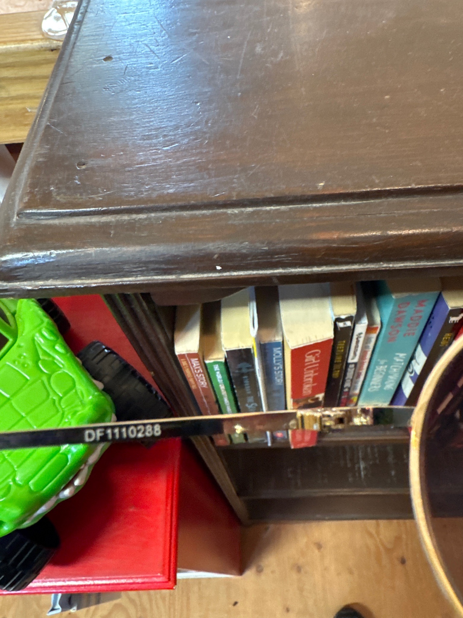 This item is the left temple arm of a pair of eyewear, likely sunglasses, featuring a multi-component construction. The temple begins with a high-shine gold-tone metal hinge and inner core, transitioning into a sleek black acetate or high-grade plastic outer casing. The most distinguishing mark is the printed alphanumeric serial or model number 'DF1110288' in a sans-serif white font on the inner temple. The hinge mechanism appears robust, indicative of designer-level manufacturing, possibly associated with high-fashion brands that utilize similar indexing systems. In terms of condition, the gold plating shows significant oxidation, surface pitting, and wear, particularly around the hinge joint and bridge area, suggesting frequent use and exposure to moisture or skin oils. The black coating on the arm also exhibits minor scuffing. The style is contemporary, likely produced within the last 10-15 years. The overall craftsmanship suggests a mass-produced luxury accessory where the metallic finish is utilitarian rather than solid precious metal. The item is displayed in a cluttered domestic environment alongside books and a green plastic toy, which does not provide further provenance but aids in scale assessment.