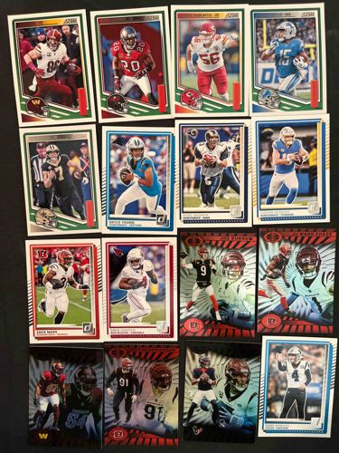 This is a collection of 15 modern American football trading cards from major manufacturers including Panini (Donruss and Illusions sub-brands) and Score. The assortment includes a mix of base cards, inserts, and potential rookie cards. Featured players include Bryce Young (Carolina Panthers), Joe Burrow (Cincinnati Bengals), Ja’Marr Chase (Cincinnati Bengals), Kurt Warner (St. Louis Rams), and Justin Herbert (Los Angeles Chargers). The cards are standard size (2.5 by 3.5 inches) and constructed from laminated cardstock with high-gloss finishes. The Donruss cards feature classic white borders with team-colored accents, while the Illusions cards display a more complex multi-layered design with 'illusion' holofoil effects and dynamic background patterns. The Score cards exhibit a green-gradient border with team helmet logos in the corner. From a condition perspective, the cards appear to be recently pulled and are currently unframed and unsleeved, though some show red adhesive-style markers on their right edges. The corners and edges generally appear sharp in the photograph, though high-resolution inspection would be required to identify micro-scratches or centering issues. These cards likely date from the 2022 to 2024 production years based on the active team rosters and the Bryce Young rookie-era card design.