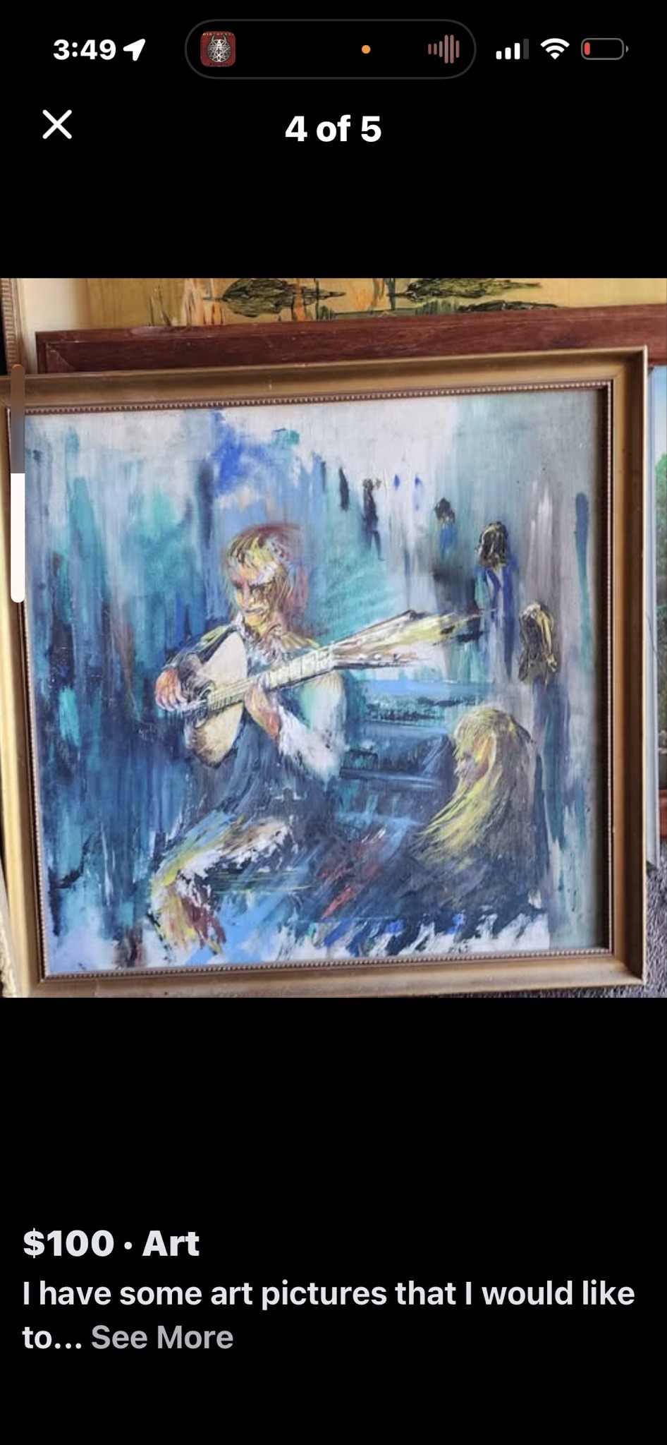 This is an original expressionist oil painting on canvas, likely dating from the mid-to-late 20th century. The composition features a central figure playing a lute-like stringed instrument, with another figure in the lower right foreground. The style utilizes heavy impasto and visible, gestural brushstrokes that create a sense of movement and energy. The color palette is dominated by cool tones including cerulean blue, navy, and charcoal gray, contrasted against the warmer ochre and cream shades used for the figures and the instrument. The work exhibits a dreamlike, blurred quality characteristic of figurative abstraction. The canvas is housed in a traditional gold-tone molded wooden frame with a beaded inner liner. While no signature is immediately visible in the provided photograph, the craftsmanship suggests an educated hand familiar with modern impressionistic techniques. The condition appears fair to good with some minor surface grime consistent with age; the frame shows light wear and minor scuffing at the corners. There are no obvious tears or significant paint loss visible. The vertical streaks in the background suggest it may represent an indoor venue or a rain-streaked window, adding an emotive layer to the genre scene.