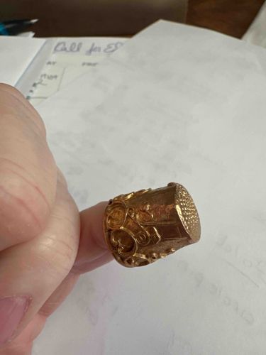 This item is an ornate sewing thimble, appearing to be crafted from a gold-toned metal, likely gold-filled or a high-carat gold alloy given the richness of the color and the level of craftsmanship. The piece features a traditional tapered conical shape with a closed, dimpled top designed to grip the head of a needle. The decorative lower band is exceptionally detailed, featuring raised Victorian-style scrollwork and openwork filigree motifs that encircle the base. This high-relief decorative band shows stylized floral or foliate elements, common in the late 19th to early 20th-century aesthetic (circa 1880-1920). The top section of the thimble exhibits a precision-punched 'honeycomb' dimple pattern extending roughly halfway down the barrel. In terms of condition, the piece shows evidence of frequent use; there is visible tarnish and darkened patina within the recessed areas of the filigree, along with minor surface abrasions and small indentations on the body. While no specific maker's marks or fineness stamps are visible in this orientation, the complexity of the cast filigree suggests a high-quality manufacturer from the late Victorian or Edwardian period. The overall construction displays excellent structural integrity without visible cracks or repairs, though the base rim shows slight irregularities from wear.