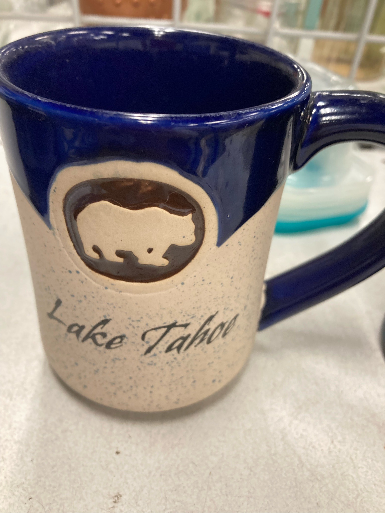 This is a heavy-duty ceramic souvenir coffee mug featuring a two-tone glaze and a prominent medallion design. The vessel stands approximately 4 to 5 inches tall with a standard wide-mouth diameter. The exterior finish displays a deep cobalt blue glaze on the top rim and interior, which drips unevenly over a matte, speckled tan or cream-colored base, indicative of a rustic, artisan-inspired mass production style. The center of the mug features an embossed brown circular medallion depicting a cream-colored silhouette of a bear, likely a black bear common to the Sierra Nevada region. Below the medallion, the words 'Lake Tahoe' are scripted in a black, cursive font. The construction includes a large, ergonomic D-shaped handle finished in matching cobalt blue glaze. Regarding condition, the mug shows minor signs of shelf wear and some localized scuffing along the blue rim and handle. The glaze has a high-gloss finish on the blue sections and a textured, matte finish on the tan sections. There are no visible major cracks or structural chips. This item is characteristic of modern regional gift shop merchandise from the late 20th to early 21st century, designed for durability and a wilderness aesthetic.
