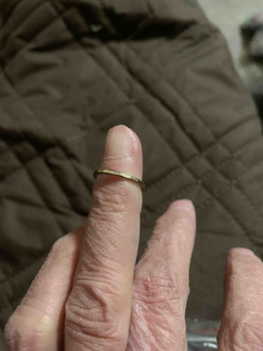 This item is a narrow, minimalist ring, appearing to be a classic wedding band or stackable ring. Based on the visual inspection, it is crafted from a yellow-tone metal, likely 10k or 14k yellow gold given the characteristic warm hue. The band is approximately 1.5mm to 2mm in width with a rounded outer profile and a flat interior, a design often referred to as a standard dome fit. There are no visible gemstones or flush-set embellishments, emphasizing a utilitarian and timeless aesthetic. The surface shows a moderate amount of wear, including fine micro-scratches and a slight dulling of the original high-polish finish, which constitutes a natural patina consistent with regular daily use over several years. While no hallmark or maker's mark is visible in the provided image due to the angle, such bands are typically stamped on the inner circumference with purity marks (e.g., '585' or '14K'). The construction appears solid rather than hollow, suggesting a mid-range quality of craftsmanship. Given its simple, unadorned style, it is difficult to date precisely, but it reflects late 20th-century to contemporary jewelry design trends where thin, stackable bands are highly prevalent.