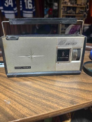 This is a vintage portable transistor radio from approximately the 1960s, branded under the 'Holiday' name. The unit features a classic mid-century rectangular silhouette with a prominent black plastic swing-handle on a chrome-finished metal wire frame. The front face is characterized by a dual-tone design: a large, perforated champagne-gold or silver-toned metal speaker grille on the left—featuring a distinctive embossed four-pointed starburst motif—and a solid metallic panel on the right. The branding 'HOLIDAY' is displayed in a black rectangular badge at the bottom left. The right side contains a square black tuning window labeled '8 TRANSISTOR' with stylized cursive text above it reading 'HIGH SENSITIVITY'. To the far right, a vertical thumbwheel dial is visible for frequency adjustment. The radio's casing is constructed of textured black plastic or faux-leather wrap over a hard frame. Condition-wise, the item exhibits significant signs of age and use, including surface grime, oxidation on the metal accents, several small rust spots on the faceplate, and localized wear on the casing edges. The 'High Sensitivity' text is slightly faded, and the overall patina suggests a well-used survivor piece. The craftsmanship is typical of 1960s Japanese-made imports, emphasizing compact solid-state electronics in a decorative, portable housing.