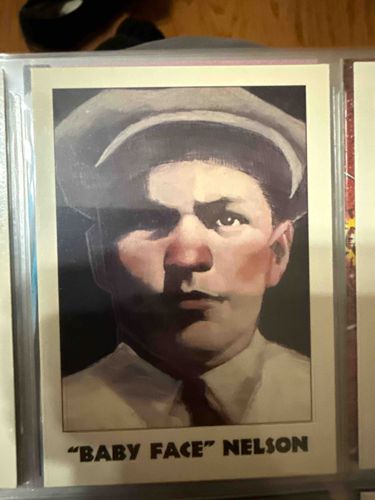 This item is a collectible trading card featuring a stylized portrait of the notorious Depression-era gangster Lester Joseph Gillis, better known as “Baby Face” Nelson. The card is printed on a rectangular off-white or cream-colored cardstock with a thin white border. The central image is a high-contrast artistic rendering of Nelson, wearing a period-appropriate newsboy cap, a collared white shirt, and a dark tie. The illustration uses a muted palette of grays, blacks, and flesh tones with a reddish tint on the nose and cheeks to emphasize the subject's features. Below the portrait, the text "“BABY FACE” NELSON" is printed in a bold, black, sans-serif font. The card appears to be part of a historical or true crime-themed series, possibly from a 1990s-era set such as the Eclipse 'True Crime' series or a similar educational/historical reprint. It is currently housed within a plastic protective sleeve, which has preserved it in excellent condition. The corners appear sharp, the centering is balanced, and there is no visible surface wear, staining, or fading. The printing quality is sharp, suggesting a modern production rather than an original vintage piece from the 1930s. The back of the card, though not visible, would historically contain biographical details or a narrative of the subject's criminal history and death in 1934.