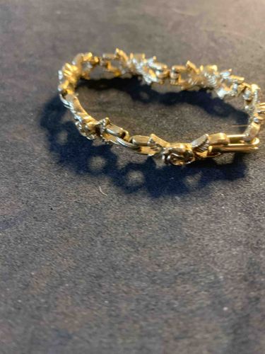 This is a vintage costume jewelry link bracelet featuring a repetitive floral and foliate design. The piece is constructed from a non-precious base metal with a bright yellow gold-tone plating. Each link is meticulously molded into the shape of a blooming rose flanked by textured leaves, demonstrating a high level of detail common in mid-20th-century costume jewelry. The bracelet measures approximately 7 inches in length and utilizes a fold-over clasp mechanism, which provides a secure and seamless closure consistent with the style of the 1950s or 1960s. The floral links are joined by small, polished connectors that allow the piece to drape comfortably around the wrist. Upon inspection, the gold plating shows significant areas of wear and tarnish, particularly on the relief edges of the rose petals and along the inner circumference of the links, revealing the darker base metal beneath. There are no clearly visible maker’s marks or signatures in the provided image, though such pieces were frequently produced by notable manufacturers like Monet or Trifari during the mid-century era. The overall craftsmanship suggests a mass-produced but well-designed fashion accessory from the post-war period, characterized by its romantic, botanical aesthetic.