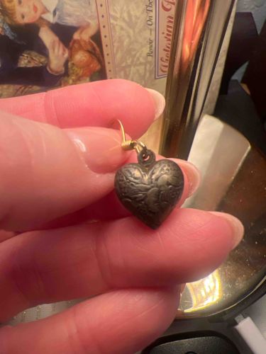 This item is a single vintage earring featuring a three-dimensional 'puff' heart charm. The charm is crafted from a base metal, likely brass or a silver-toned alloy, that has developed a significant dark aged patina over time. The front face of the heart features high-relief repoussé or stamped detailing depicting a cherub or cupid figure nestled among floral or scrollwork elements, a style popular in late Victorian and Art Nouveau revival jewelry. The charm measures approximately 12-15mm in width. It is suspended from a contemporary gold-toned fishhook (shepherd's hook) ear wire by a small integrated loop and jump ring. The jump ring shows some discoloration and may be a replacement. The condition is fair to good for a vintage piece; there is heavy oxidation and surface grime in the recessed areas of the design, which enhances the visual depth but indicates a lack of recent professional cleaning. No specific maker's marks or metal purity hallmarks are visible in the provided image. This piece likely dates from the mid-to-late 20th century, utilizing earlier romantic motifs. The craftsmanship is decent commercial quality, showing clear definition in the stamped motif despite the surface wear.