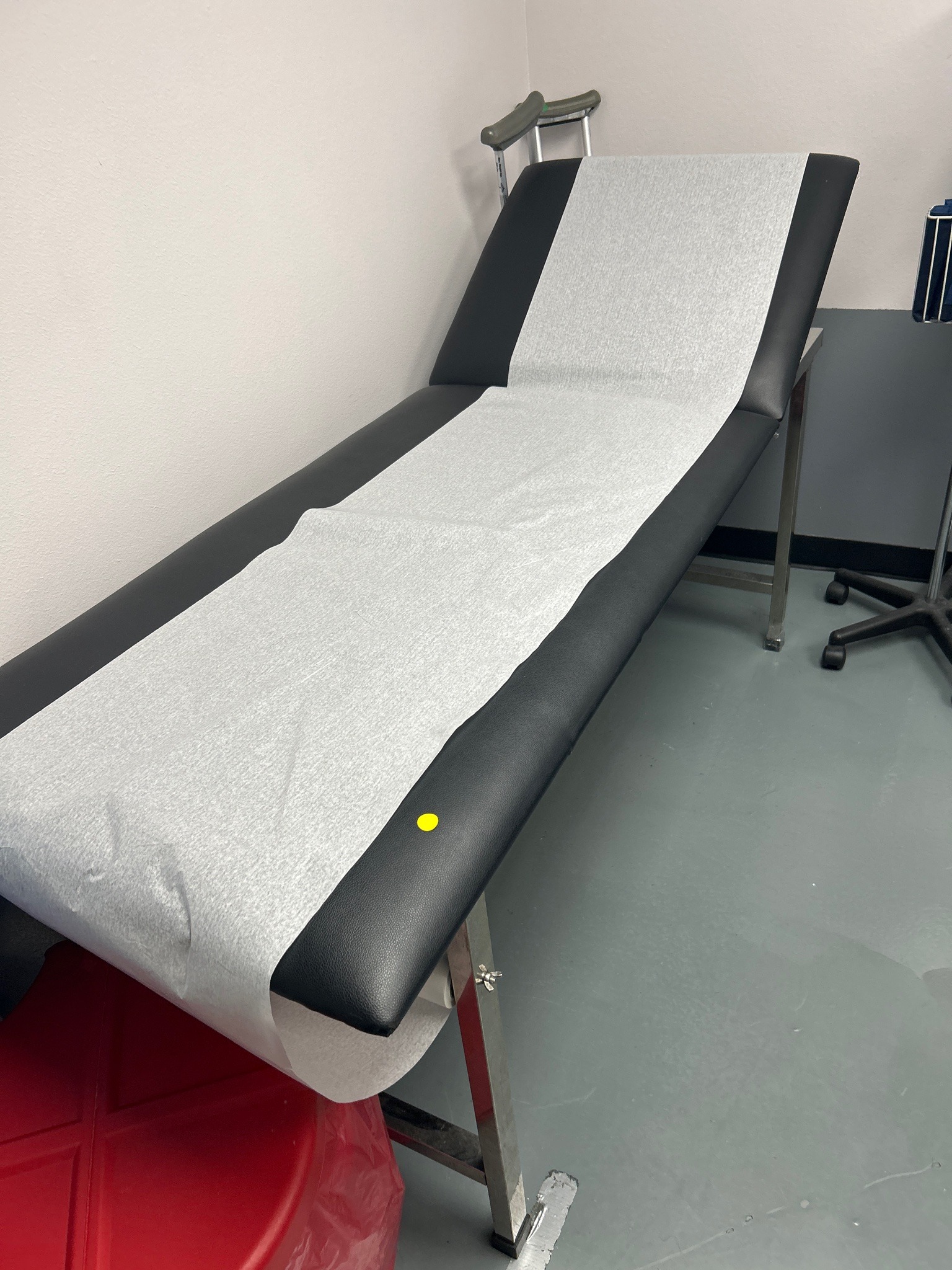 This is a standard medical examination table used in clinical settings. The table features a durable stainless steel frame with a polished finish, designed for hygiene and structural integrity. The upholstery consists of a black vinyl or high-grade synthetic leather covering over a firm foam cushion, providing a non-porous surface that is easy to sanitize. It is constructed with an adjustable headrest section that is currently elevated, secured by a mechanical ratchet or manual adjustment system. A roll of white disposable examination paper is draped across the length of the table, held by a dispenser rod located at the head end. A small yellow circular adhesive sticker is visible on the vinyl at the foot end, possibly used for inventory or marking purposes. The table legs appear to be square-profile stainless steel tubing, with visible welds and leveling feet. The general condition appears to be well-maintained and functional, with no significant tears in the upholstery or corrosion on the metal frame. The design is utilitarian, typical of mid-to-late 20th-century medical equipment, prioritizing durability and ease of cleaning over aesthetic flourish.