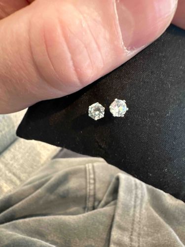 A pair of classic solitaire stud earrings featuring round brilliant cut colorless gemstones, likely diamonds or high-quality diamond simulants such as cubic zirconia or moissanite. Each stone is securely set in a traditional six-prong mounting, which provides a symmetrical crown-like appearance and enhances the stone's stability. The metal appears to be a white-tone precious metal, potentially 14k or 18k white gold or platinum, based on the bright silver-colored sheen and lack of immediate surface tarnish. The gemstones exhibit high dispersion and light return, consistent with modern brilliant faceting. Given the relative size against a human finger, each stone is estimated to be between 0.50 and 0.75 carats (roughly 5mm to 6mm in diameter). The condition appears excellent with no visible chips or fractures to the stones, though a microscopic examination would be required to assess clarity and internal inclusions. The prongs appear well-maintained and tightly gripping the girdles. This style is timeless, quintessential of late 20th-century to contemporary jewelry design. The lack of visible hallmarks in this view suggests they are located on the posts or butterfly backings, which are not visible here.