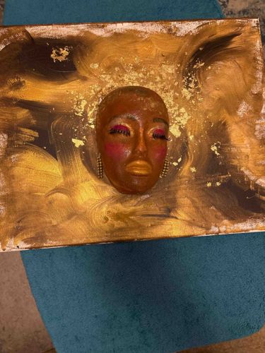 This unique artwork is a mixed-media 3D relief sculpture mounted on a rectangular canvas. The central focus is a brown-toned, stylized feminine mask with a smooth, varnished finish. The face features prominent makeup application, including vibrant pink blush on the cheeks and eyelids, accented by long, artificial eyelashes and metallic gold-painted lips. Small beaded or studded jewelry drapes from the sides of the face, mimicking earrings. The mask is set against a dynamic background of thick, gestural brushstrokes in shades of gold, ochre, and black, interspersed with applied gold leaf or metallic flakes that create a textured halo effect around the head. The canvas substrate shows visible paint application along the edges and some uneven texture, suggesting a contemporary, handcrafted aesthetic. The condition appears stable, though the gold leaf shows intentional irregularity. The piece displays a blend of portraiture and decorative sculptural elements, demonstrating a modern urban art style characteristic of contemporary independent artists. The craftsmanship is expressive, utilizing a combination of traditional painting techniques and found-object assemblage to create a soulful and regal presence.