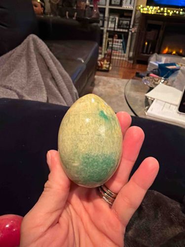 This item is a decorative egg-shaped object, approximately 2 to 3 inches in height, carved from a natural stone material. The stone displays a variegated color palette consisting of creamy beige, pale sand, and notable patches of turquoise or teal-green minerals. The texture appears crystalline or grain-like under a high-gloss polished finish, suggesting it could be a variety of alabaster, marble, or perhaps a mineral specimen like amazonite or dyed onyx. It possesses a classic ovoid shape with a smooth, continuous surface. There are visible horizontal internal fractures or natural veins running across the center, which are typical for stone carvings of this nature. The overall condition appears good with high reflectivity, though there is a small darkened inclusion or possible surface nick near the upper tapered end. Such items were popular home decor pieces from the mid-to-late 20th century (1970s-1990s) and are often valued for their tactile quality and natural mineral aesthetics. There are no visible maker's marks or signatures, consistent with mass-produced artisanal lapidary work often imported from regions like Pakistan or Italy.