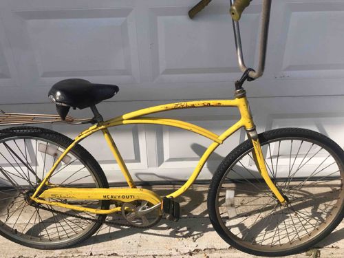 This is a vintage Schwinn 'Heavy-Duti' cruiser bicycle, likely dating from the 1960s or 1970s. The bike features a signature cantilever steel frame finished in a faded school-bus yellow paint. It is equipped with high-rise 'ape hanger' handlebars and a black padded saddle. Notable markings include the 'Schwinn' logo and 'HEAVY-DUTI' script on the chain guard, along with pinstripe detailing on the front fork. This model was originally engineered for industrial use and heavy-duty delivery work, characterized by its reinforced frame and thicker spokes. The condition is used with significant signs of age and wear; there is visible paint loss, surface rust across the frame and chrome components, and scratching on the decals. The rear metal luggage rack shows significant oxidation. The tires and brake components appear aged and would likely require replacement for safe operation. Despite the wear, the bike retains its original structural integrity and core vintage components, making it a desirable candidate for a full mechanical and cosmetic restoration.