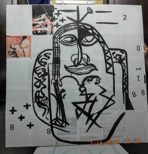 This is a large-scale contemporary mixed-media artwork on paper, measuring approximately 2217 x 2301 pixels as depicted. The piece features a prominent, centrally located primitive or tribal-inspired face executed in heavy, gestural black ink or acrylic paint. The composition is highly complex, utilizing a multi-layered technique that combines collage, drawing, and found-material elements. In the upper-left quadrant, there are two distinct photographic collages depicting human figures, one apparently involving medical or surgical imagery. The central figure is characterized by bold, thick black outlines with internal geometric and curvilinear patterns, evoking a Neo-Expressionist style reminiscent of Basquiat. The background appears to be constructed from multiple joined sheets of paper, some of which feature faint printed grids or ledger lines, suggesting reused administrative documents. Various alphanumeric symbols and tallies are scattered across the work, including several '8's, a diamond symbol, and crosses. The overall condition shows signs of an intentionally raw and raw aesthetic with visible seams between papers, slight buckling, and minor surface imperfections. The craftsmanship is expressive rather than precise, favoring emotional impact and raw texture. The work bears a digital timestamp of 7/18/2015, which serves as a contemporary point of reference. No formal artist signature is immediately visible on the front face, marking it as the work of an unknown hand.