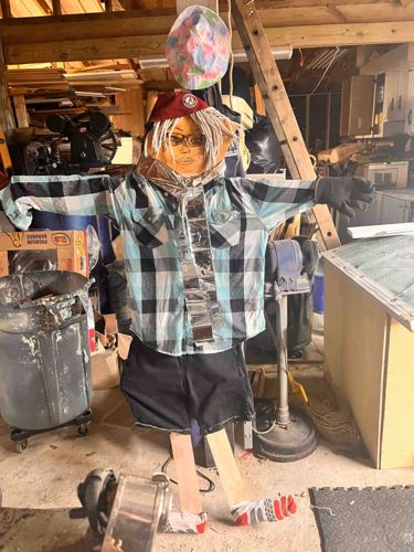 This life-sized, handmade scarecrow or folk-art mannequin is constructed from a combination of wood, textiles, and mixed media. The core structure features a wooden frame acting as 'legs' and 'arms,' likely composed of standard 1x3 or 2x4 lumber pieces. The head is a flat, circular wooden cutout featuring a hand-drawn illustration of a face with glasses, framed by white yarn or paper strips representing hair. It is dressed in a teal and black buffalo plaid flannel shirt and dark denim shorts. Notable accessories include a red beanie with a circular patch, a metallic silver foil scarf or 'tie,' a black work glove on the left hand, and mismatched socks covering the wooden foot pedestals. The craftsmanship is of a DIY or folk-art style, emphasizing character and repurposed materials over professional tailoring. Condition is consistent with outdoor or garage storage; the fabrics appear slightly wrinkled and the wood is unfinished. This piece appears to be a contemporary creation, likely for seasonal decoration or as a whimsical workshop companion. Its unique assembly of found objects and creative hand-drawn features represents an idiosyncratic piece of modern vernacular art.