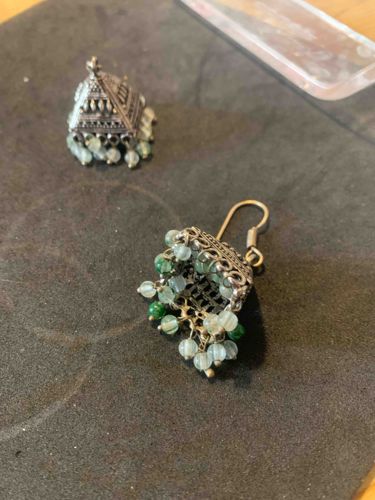 This is a pair of traditional Indian Jhumka-style earrings, characterized by their bell-shaped drop design. The earrings are crafted from an oxidized silver-toned metal, likely a base metal alloy or sterling silver with an antiqued finish to highlight the intricate filigree and geometric patterns. Each earring features a tiered, pyramidal dome structure with open-work metal detailing and scalloped edges. Suspended from the bottom rim are numerous small, round beads known as ghungroos, appearing in shades of pale mint and forest green glass or semi-precious stone. These beads are attached via small metal loops, providing movement and a delicate tinkling sound. The earrings utilize a simple fishhook or French wire closure, typical of ethnic fusion jewelry. The condition appears fair to good, with a heavy dark patina that emphasizes the recesses of the design, though some slight irregularities in the bead spacing and minor surface wear are visible. These contemporary pieces reflect a tribal or 'Banjara' aesthetic, popular in late 20th to early 21st-century artisanal jewelry markets. The craftsmanship shows mass-produced yet detailed metal casting typical of the Rajasthan or Gujarat regions.