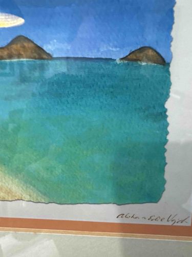 This item is an original watercolor painting depicting a tropical coastal scene, likely a Hawaiian landscape given the 'Aloha' inscription. The artwork is executed on heavy-weight watercolor paper with a distinctive deckled or hand-torn right edge, which has been float-mounted to showcase the paper's texture. The composition features vibrant turquoise and cerulean blue waters in the foreground and middle ground, with two volcanic-style islands or small mountains on the horizon under a bright blue sky. A portion of a sandy beach is visible in the lower-left corner, and a bright, stylized sun or moon occupies the upper-left quadrant. The painting is signed in the lower right margin on the backing board with the handwritten inscription 'Aloha ~ Eddie Vyhital'. The style is illustrative and contemporary, utilizing wet-on-wet techniques to achieve the soft gradients in the water. The piece is professionally framed under glass with a multi-layered matting system consisting of a pale blue outer mat and a thin orange inner accent mat. The condition appears excellent with no visible foxing, fading, or moisture damage to the paper or pigments. The craftsmanship is high, reflecting a specific regional art style popular in the late 20th to early 21st century.