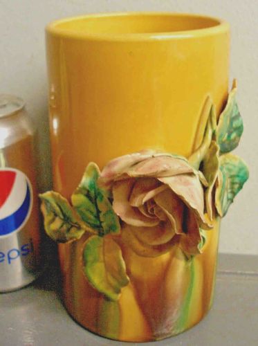This item is a cylindrical ceramic vase featuring a vibrant, mustard-yellow glazed body with an applied three-dimensional floral motif. The focal point is a large, hand-formed rose in relief, crafted with delicate, thin petals finished in a muted dusty pink or peach glaze. The rose is flanked by sculpted green leaves that wrap around the lower half of the vessel. The base of the vase shows some vertical color bleeding or drip glaze effects in shades of brown and green, suggesting a transitional glazing technique. In terms of size, the vase stands approximately 10 to 12 inches tall, based on the scale of the standard soda can pictured nearby. The construction is heavy-walled ceramic, typical of mid-20th-century pottery production. Notable condition issues include visible crazing throughout the yellow glaze, which is common in older ceramics, and possible minor chipping or rough edges on the fragile petals and leaf tips of the high-relief application. No specific maker's mark is visible from this angle, but the style is consistent with mid-century Mediterranean or California art pottery from the 1950s or 1960s. The craftsmanship is characterized by the contrast between the smooth, industrial shape of the cylinder and the organic, hand-modeled nature of the floral applique.