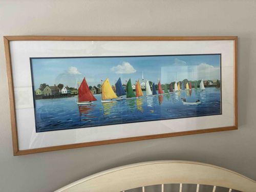 This item is a panoramic horizontal framed print depicting the iconic 'Rainbow Fleet' of Nantucket. The artwork showcases a line of wooden catboats with vibrant, multi-colored sails (red, yellow, blue, green, and orange) gliding across a calm body of water, likely Nantucket Harbor. In the background, a coastal village featuring gray-shingled buildings and a prominent white church steeple is visible against a clear blue sky with fluffy white clouds. The piece uses a bright, saturated color palette to create a cheerful maritime atmosphere. It is professionally mounted within a white mat with a subtle dark inner border, housed in a thin, light-wood natural finish frame. The overall construction appears to be high-quality modern framing with glass or acrylic protection. The piece captures a folk-art aesthetic typical of coastal New England decor. The condition appears to be excellent with no visible fading, warping of the paper, or significant damage to the frame. This style and subject matter are closely associated with Nantucket tradition and the annual Opera House Cup regatta, suggesting the piece dates from the late 20th to early 21st century.