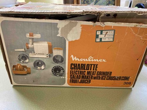 This is a vintage Moulinex 'Charlotte' multi-purpose electric kitchen appliance, specifically Model 308, preserved in its original retail packaging. The item is a versatile food processor unit designed to function as an electric meat grinder, salad maker with ice crusher cone, and fruit juicer. The appliance features a classic mid-century aesthetic with a white plastic main body accented by ochre or harvest gold trim, typical of 1970s kitchenware design. The original box illustrates the primary unit alongside several attachments including metallic grinding plates, a citrus juicer head, and various cones for slicing or grating. The packaging shows significant signs of age and wear, including crushed corners, edge fraying, surface tearing, and a partial retail price sticker. There is visible discoloration and paper loss on the front panel near the product name. While the box is original, its condition is considered fair to poor due to structural weakness and surface damage. The appliance inside is presumed to be constructed of high-impact plastics and cast metals, reflecting the durable manufacturing standards of the era. The branding 'Moulinex' and the product name 'Charlotte' are clearly visible in a vintage-style typeface, indicating its origin likely from the European markets (French-made) during the late 20th century.