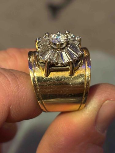 This is a significant cocktail or statement ring featuring a ballerina-style diamond cluster set atop a wide, tapered yellow gold band. The central focal point is a single round brilliant-cut diamond, held in a four-prong white metal setting. Radiating from this center stone is a sunburst halo of tapered baguette-cut diamonds, set into a tiered white metal gallery that contrasts with the yellow gold shank. The band itself is exceptionally wide, exhibiting a flared architectural silhouette with slightly raised outer edges. The metal appears to be at least 14k or 18k yellow gold, though no hallmarks are visible in the image. The construction suggests a custom or high-end mid-century to late 20th-century design, likely dating from the 1960s to 1980s. In terms of condition, the yellow gold shank shows significant surface scratching, scuffs, and a dulling of the polish consistent with heavy frequent wear. The white metal setting around the diamonds shows some darkening which could be tarnish or dirt buildup. One of the large outer prongs on the left appears slightly askew, suggesting the ring may need a professional cleaning and prong tightening to ensure the security of the stones. Despite the surface wear, the craftsmanship is robust, featuring a heavy metallic weight and a complex multi-stone arrangement that maximizes light return.