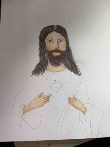 This is an original hand-drawn illustration depicting the Sacred Heart of Jesus. The artwork is rendered on a white, slightly textured paper, likely from a sketchbook or drawing pad. The medium appears to be a combination of colored pencils for the skin, hair, and beard, with light graphite or ink outlines used for the clothing and the central heart icon. The figure of Jesus is shown from the chest up, featuring shoulder-length dark brown hair and a full beard with visible vertical pencil strokes. One hand points toward the heart, which is drawn in simple outline with a cross emerging from the top and radiating light rays. The clothing remains largely unfinished, consisting primarily of faint grey outlines of a robe and sash. There is no visible artist signature or date, though the style suggests it is a contemporary amateur or student work. The paper shows slight smudging in the white space, notably to the right of the head and near the bottom, which is common in hand-drawn pencil works. The proportions are slightly stylized, leaning towards a folk art or devotional art aesthetic. The condition is fair, with no significant tears or creases, but it lacks a professional finish as large portions of the canvas remain bare and in sketch form.