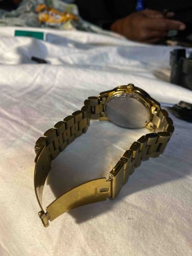 This is a contemporary men's wristwatch featuring a yellow gold-tone finish over what appears to be a stainless steel base. The watch is constructed with a round case and a matching three-link 'President' style bracelet. The metal shows signs of moderate wear, including superficial scratches and scuffs consistent with regular usage. The case back is silver-toned, likely brushed stainless steel, which is common in plated watches to prevent skin irritation and corrosion. The bracelet is secured with a fold-over deployment clasp, which shows a small inscription or mark on the internal hinge, likely indicating 'Stainless Steel' or a brand logo. The crystal over the dial appears intact from this angle, though the dial itself is not visible. The bezel is smooth and polished, and the crown is located at the standard 3 o'clock position. This style is characteristic of modern fashion watches from the late 20th to early 21st century. The craftsmanship is indicative of a mass-produced consumer grade timepiece rather than high-luxury horology, as evidenced by the plating wear on some link edges and the simple construction of the clasp mechanism.