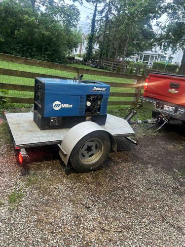 This is a heavy-duty Miller Bobcat engine-driven welder and power generator mounted on a single-axle utility trailer. The unit features Miller's signature blue powder-coated steel housing with white and black branding decals. The construction consists of a robust metal enclosure housing an internal combustion engine, likely gasoline powered, capable of both Stick/TIG welding and generating AC power. Notable features include a top-mounted exhaust port, a front-facing control panel with various outlets and adjustment knobs, and side ventilation louvers. The visible condition shows moderate outdoor use with some light surface grime and minor scuffing on the lower black chassis, but the main blue housing remains largely intact without significant denting or corrosion. The unit is securely bolted to a custom-fit trailer with an aluminum diamond-plate deck, metal fenders, and standard pneumatic tires. The trailer includes safety lighting and a standard hitch assembly. Based on the branding and style, this model likely dates from the 2010s to the early 2020s. It represents a professional-grade piece of industrial equipment valued for its dual-purpose functionality in construction and field repair work.