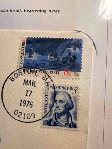 This item is a philatelic cover featuring two United States postage stamps with a clear 'Boston, MA' postmark dated March 17, 1976. The top stamp is an 8-cent commemorative issue from the 1973 Bicentennial Series, specifically depicting 'The Boston Tea Party.' It features a multi-color graphic of colonial figures in a boat at night, using dark blues, blacks, and a vibrant orange glow from a lantern. Below it is a 5-cent definitive stamp featuring a monochromatic blue engraving of George Washington. Both stamps have standard perforations and are affixed to a heavy-weight, off-white textured cream paper or cardstock that shows a slight deckle-like surface quality. A circular black ink hand-stamp (cancel) clearly displays 'BOSTON, MA' with the date 'MAR. 17 1976' and the zip code '02109.' This specific date is significant as it marks 'Evacuation Day' in Boston, coinciding with the 200th anniversary year of US independence. The overall condition appears excellent with crisp postmark ink and well-defined stamp edges, though some minor yellowing of the paper glue may be present consistent with mid-20th-century ephemera. The item is currently held in place by a clear archival corner mount against a white backing, indicating it is part of a curated collection or commemorative book.
