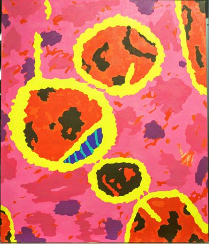 This is a vertical abstract painting characterized by vibrant, high-contrast colors and biomorphic shapes. The composition features several circular or oval-like cells outlined in a jagged canary yellow, containing a saturated orange interior with irregular black mottling. The largest central cell includes a distinct blue and cyan striped crescent shape. The background is a complex, flat-layered field of bubblegum pink and magenta with scattered dark purple and orange blots. The style is reminiscent of mid-to-late 20th-century Neo-Expressionism or contemporary psychedelic abstraction. The application appears to be acrylic or gouache on a flat substrate, likely canvas or wood panel, given the uniform texture. The execution shows deliberate serrated edges on the yellow outlines, suggesting a graphic or pattern-based approach. No visible signature or artist's marks are present on the front surface. The piece is in good condition with no apparent flaking, cracking, or discoloration beyond the intended saturated palette. The lack of traditional perspective and use of bold primary and secondary colors creates a high-energy, flattened visual space typical of modern decorative fine art.