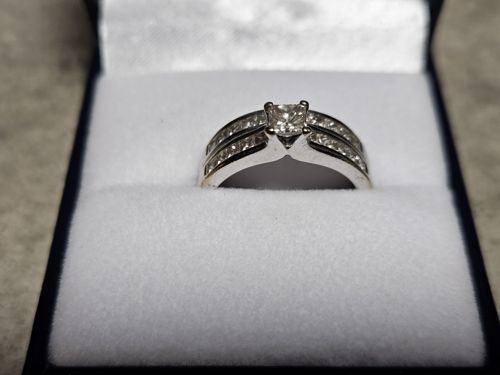 This is a contemporary engagement ring crafted in a white metal, likely 14k or 18k white gold or platinum, presented in a black velvet-lined jewelry box. The centerpiece features a square princess-cut diamond, securely held in a traditional four-prong setting that elevates the stone to maximize light entry. The shank of the ring exhibits a split-shoulder design, with each side featuring two distinct rows of channel-set smaller diamonds. These accent stones appear to be round brilliant or small princess cuts, meticulously aligned to create a seamless wall of sparkle along the band. The metal finish is high-polish, showing minimal signs of wear, though some light surface scratches are visible upon close inspection, suggesting light use or handling. The construction is robust, with a thick bridge and well-defined channels, indicating quality craftsmanship. While no maker's marks are visible in the photograph, the style is characteristic of modern bridal jewelry from the late 20th to early 21st century. The stones appear clear and colorless to the naked eye, though an official grade would require a gemological examination. Overall, the piece presents in very good condition with no visible missing stones or bent prongs.