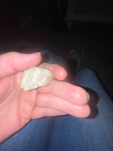 This item is a small, hand-sized geological specimen, likely a variety of calcite, quartz, or fluorite, presenting in a raw, unpolished state. The specimen measures approximately 2.5 to 3 centimeters in length, based on its scale relative to the person's hand. It displays a pale, milky-green to off-white coloration with a semi-translucent quality that allows light to penetrate the surface layers. The physical construction is characterized by a crystalline or rhombohedral structure, showing natural cleavage planes and jagged, uneven edges typical of rough mineral fragments. There are visible internal fractures and inclusions which contribute to its cloudy appearance. No artificial markings, signatures, or maker's stamps are present, indicating it is a natural find or a raw mineral sample from a collection. The condition is consistent with a raw specimen, featuring natural wear, surface dust, and sharp terminations. Its waxy to vitreous luster suggests a mid-range hardness. This piece lacks the precision of a lapidary cut, emphasizing its natural craftsmanship and geological origin rather than a manufactured style period.