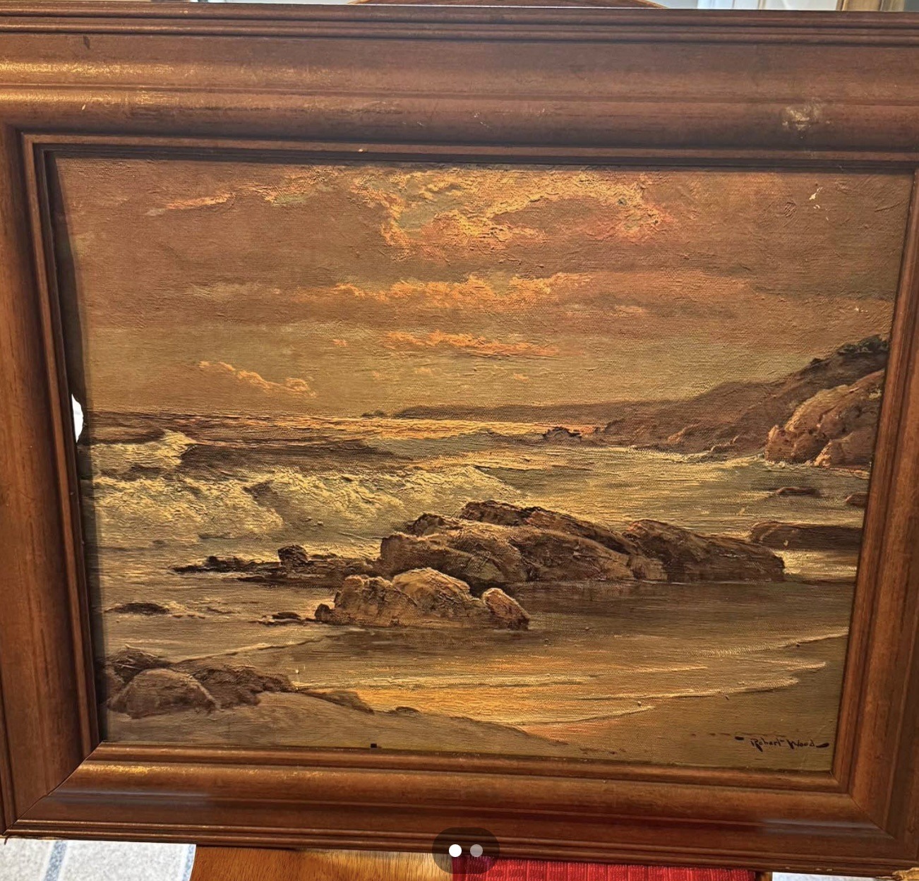 This is a vintage oil on canvas landscape depicting a coastal seascape, signed by the prolific American artist Robert Wood (1889-1979) in the lower right corner. The painting features a dramatic scene of waves crashing against a rocky shoreline under a warm, late-afternoon sky filled with textured clouds. The palette is dominated by ochre, sienna, and muted blue tones, characteristic of Wood's mid-20th-century impressionistic style. The brushwork is heavy and expressive, particularly in the white foam of the waves and the jagged edges of the rocks. The piece is housed in a substantial, deep-profile dark wood frame. Regarding condition, there is a significant and highly visible puncture or tear on the left edge of the canvas (mid-height), which exposes the backing material. There are also small white flecks across the surface that appear to be paint loss or debris. The varnish has likely yellowed over time, adding to the warm amber cast of the scene. The frame shows minor scuffing and dust accumulation, but appears structurally sound. This work represents wood's popular coastal series, likely dating from the 1950s or 1960s, and demonstrates his skill in capturing atmospheric light and movement.