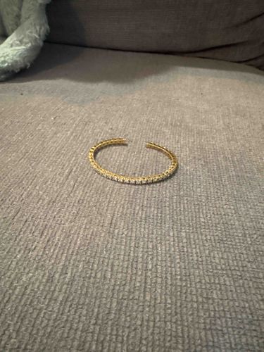 This fine jewelry piece is an open-style cuff bangle crafted in 14k yellow gold, featuring a continuous row of natural (mined), round brilliant-cut diamonds. The diamonds are set in a rigid, semi-flexible frame with individual four-prong mountings that provide both security and maximum light exposure for the stones. Based on the provided context, the diamonds are confirmed as natural, non-lab-grown, which significantly impacts its market value and desirability. The yellow gold setting offers a classic, warm contrast to the bright white brilliance of the diamonds. The construction follows a contemporary minimalist style, designed for a comfortable fit around the wrist without a clasp, relying on the tension of the metal. While specific carat weight and clarity cannot be determined from the image, the craftsmanship appears high-quality with uniform stone calibration and consistent prong work. The condition is excellent with no visible missing stones or significant metal deformation. This style of 'tennis' cuff is a staple of modern luxury fashion, likely produced within the last 10-15 years, standing as a timeless addition to a jewelry collection.