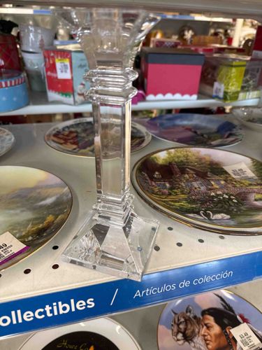 This item is a single, clear pressed glass candlestick featuring a modern, geometric design. It stands approximately 8 to 10 inches tall and is constructed from thick, transparent glass with a distinct square silhouette. The piece is composed of a flared square socket at the top, transitioning into a multi-tiered decorative neck with horizontal ribbing. The central stem is a long, slender rectangular column that meets a stepped pedestal. The base is a wide, square plinth with beveled edges, providing stability. The clarity of the glass suggests a contemporary manufacturing date, likely late 20th or early 21st century. While no specific maker's marks are visible in the image, the sharp linear edges and lack of decorative etching indicate a minimalist or utilitarian style. The condition appears to be good with no obvious chips or cracks visible, though shelf wear such as faint scratches on the underside of the base is typical for items found in a secondary market setting. The craftsmanship reflects standard commercial glass pressing techniques rather than hand-blown artistry.