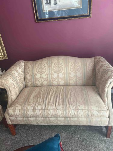 This item is a two-seat settee or loveseat featuring a classic camelback silhouette, characterized by a central hump along the top rail that gently curves down into high, flared out-scrolled arms. The sofa is fully upholstered in a traditional woven damask fabric featuring vertical stripes alternating with large-scale floral and foliate medallions. The color palette across the textile is a muted combination of champagne, cream, and soft sage green. The piece is supported by four square, straight mahogany-finished wood legs, which suggest a transition towards Neo-Classical or Hepplewhite-inspired styling. The seat consists of a single long boxed cushion with matching piping details. Regarding condition, the upholstery exhibits significant visible rippling and sagging on the seat cushion, suggesting a loss of tension in the underlying suspension or compression of the internal foam/fill over time. There are no immediate signs of major staining or structural wood breakage visible from this angle, though the fabric appears slightly aged. This piece likely dates from the late 20th century, approximately 1980-1995, as a high-quality reproduction of an 18th-century English design. The craftsmanship is evident in the alignment of the patterned fabric across the backrest and the tailored piping.