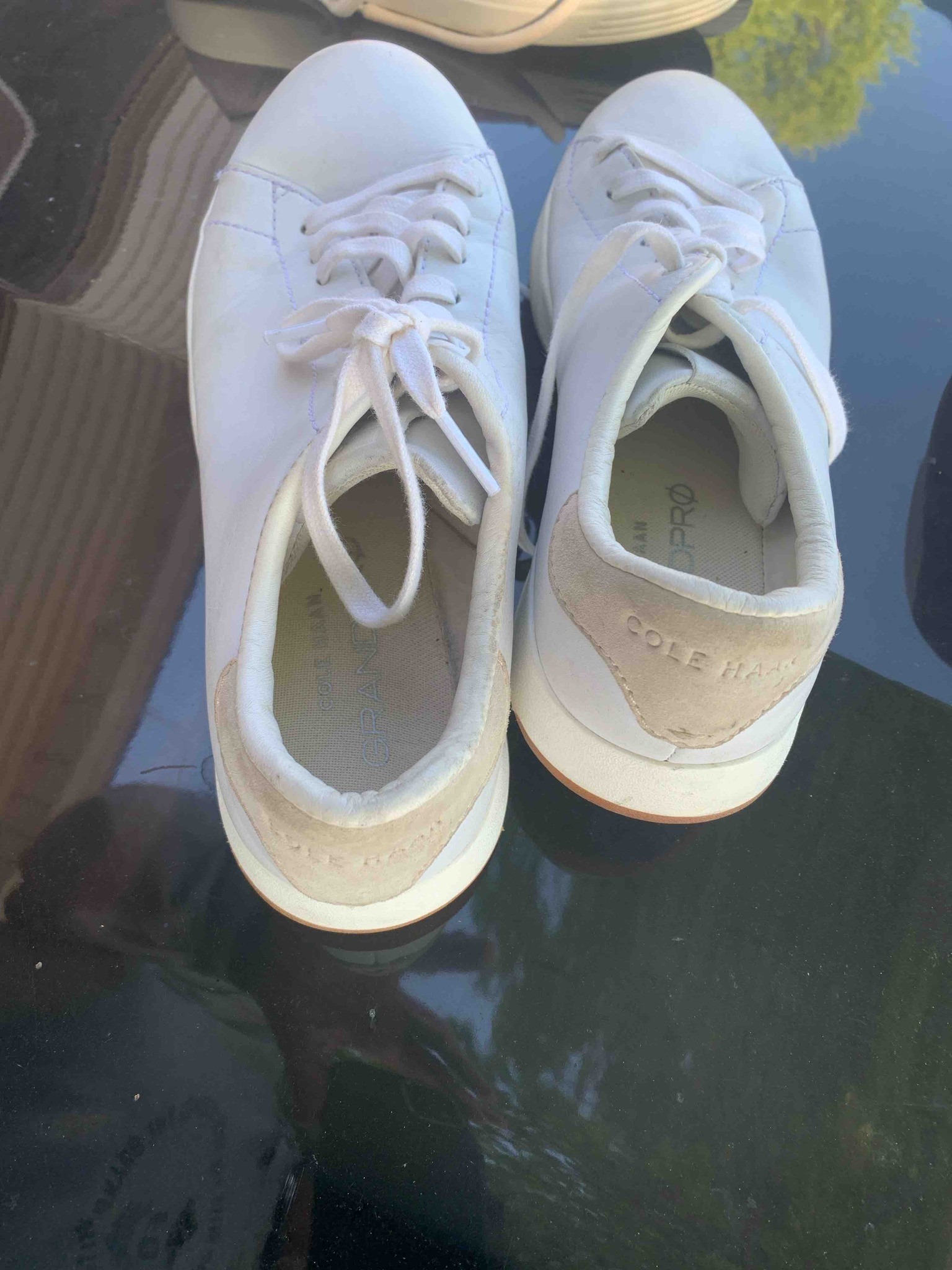 A pair of men's contemporary lifestyle sneakers by Cole Haan, specifically from the GrandPrø Rally series. These low-top shoes are constructed from smooth white leather uppers with a minimalist, clean-lined aesthetic. A notable design feature is the light grey or tan suede heel tab, which is debossed with the 'COLE HAAN' brand name. The interior features a cushioned insole branded with 'GRANDPRØ' and 'COLE HAAN'. The sneakers utilize a monochromatic white tonal stitching throughout and matching white flat-style cotton laces. The outsole is a standard white rubber cupsole with a subtle brown or gum-colored tread visible at the bottom edge. In terms of condition, the items show moderate signs of wear including visible scuffing on the toe caps, slight creasing of the leather across the vamp, and significant darkening or soiling on the suede heel tabs and interior collar lining. The laces appear slightly frayed and discolored from use. These shoes represent a modern 'athleisure' style, likely manufactured within the last 5 years, characterized by their ultra-lightweight construction and versatile business-casual appeal.