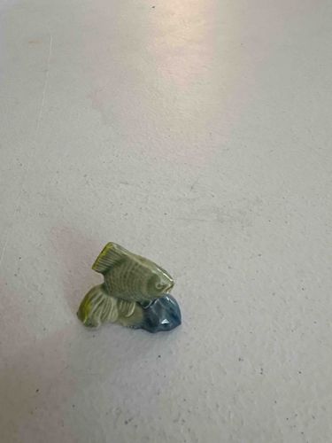 This item is a small-scale miniature ceramic figurine depicting an angelfish swimming above a stylized blue coral or rock base. The piece is crafted from porcelain or fine earthenware and finished with a multi-colored glaze. The fish itself features a mossy green body with darker green vertical striations representing its scales and anatomical markings. The fins, including the prominent dorsal and tail fins, are textured with fine linear indentations to simulate movement and structure. The glaze exhibits a soft, satin-to-glossy finish that captures light, enhancing the three-dimensional quality of the carving. The base is finished in a darker blue-grey glaze, providing a contrast to the lighter green of the fish. Based on the style and size, this piece appears to be a mid-20th-century decorative miniature, possibly a Wade Whimsie or a similar collectible ceramic from that era. The craftsmanship shows careful attention to detail despite its diminutive size, with no obvious chips or cracks visible in the provided image. The colors are well-preserved, suggesting it has been stored in a protected environment. These miniatures were often sold as standalone collectibles or included as promotional items in packaged goods like tea.