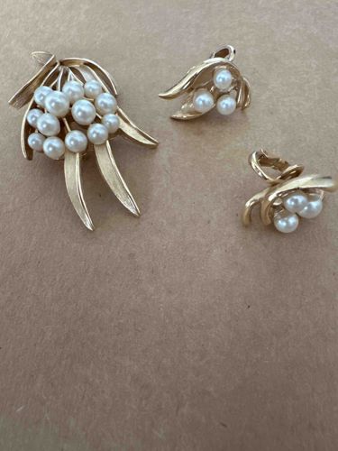 Vintage Trifari Brushed Gold-Tone and Faux Pearl Brooch and Clip-on Earrings Set