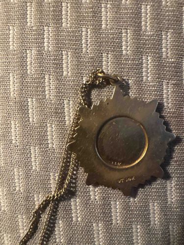 This item is a vintage gold pendant necklace featuring a starburst or sunburst design. The pendant is constructed from what appears to be yellow gold, with a central circular recessed area on the reverse side. The reverse of the ornament exhibits two distinct hallmarks: one marked '14K' inside the central circle and another marked 'ST 14K' on the lower ray of the starburst design, indicating its gold purity. The pendant has a multi-pointed, jagged edge creating a celestial sunburst silhouette. It is attached to a fine-link gold chain via a circular jumping ring. In terms of condition, the metal shows visible surface scratches, scuffs, and a dulling of the polish, which is consistent with age and frequent wear. There is a noticeable patina and slight tarnishing in the recessed areas. The craftsmanship suggests a mid-20th-century mass-produced jewelry piece, potentially a commemorative medal, fraternal organization pin conversion, or a decorative charm. The overall length is small, likely intended as a dainty necklace or charm. No visible gemstones are present on this side, though the front likely contains a central stone or enamel work.