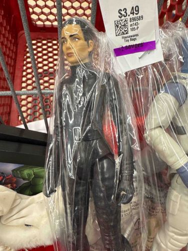 This is a plastic action figure of the character Trinity from 'The Matrix' film series, likely part of the Series 1 line by N2 Toys released around 1999. The figure stands approximately 6 inches tall and is constructed from molded PVC plastic. It features a likeness of actress Carrie-Anne Moss with a realistic skin tone paint application and short dark hair. The figure is clad in her iconic high-gloss black 'slicker' or tactical bodysuit, designed to mimic the appearance of leather or latex from the film. The outfit includes a molded belt with a silver-painted buckle and textured detailing on the legs and boots. This specific item is currently packaged in a secondary market clear plastic bag with a thrift store price tag ($3.49) from Savers, indicating it is a loose, pre-owned toy rather than being in its original blister card packaging. Condition-wise, the figure appears structurally intact with visible points of articulation at the neck, shoulders, and hips. There is some minor surface dust and potential light scuffing on the black finish consistent with play wear and bulk storage. The paint on the face appears well-preserved, though minor paint transfer or loss on the high-contact areas of the black suit is common for this vintage. The figure represents a specific era of late 90s toy manufacturing characterized by 'sculpt-over-articulation' aesthetics.