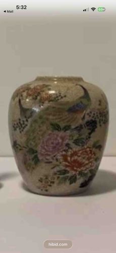 This item is an ovoid-shaped ceramic ginger jar or vase, likely of Japanese origin and crafted in the celebrated Satsuma style. The vessel is constructed from earthenware with a characteristic cream-colored crackle glaze that serves as a canvas for the detailed polychrome enamel decorations. The central motif features a brightly colored peacock with its plumage trailing amidst large flowering peonies in shades of pink, orange, and mauve. The artistry employs gold-tone accents (moriage or gilding) to highlight the feather details and floral outlines, typical of late Meiji to Taisho period aesthetics or early 20th-century export ware for the Western market. The jar features a short, narrow neck without its original lid. The body tapers gracefully toward a flat, circular base. Physically, the piece shows a consistent all-over fine crackle pattern, which is an intentional design element of Satsuma pottery. However, some darkening of the crackle lines suggests age and handling. There are no visible chips or cracks from this angle, though the lack of a lid and potential fading of the gilding on the rim are noted condition factors. The craftsmanship exhibits typical mass-produced quality for the mid-20th century decorative market, though it maintains the elaborate visual appeal of traditional Satsuma wares.