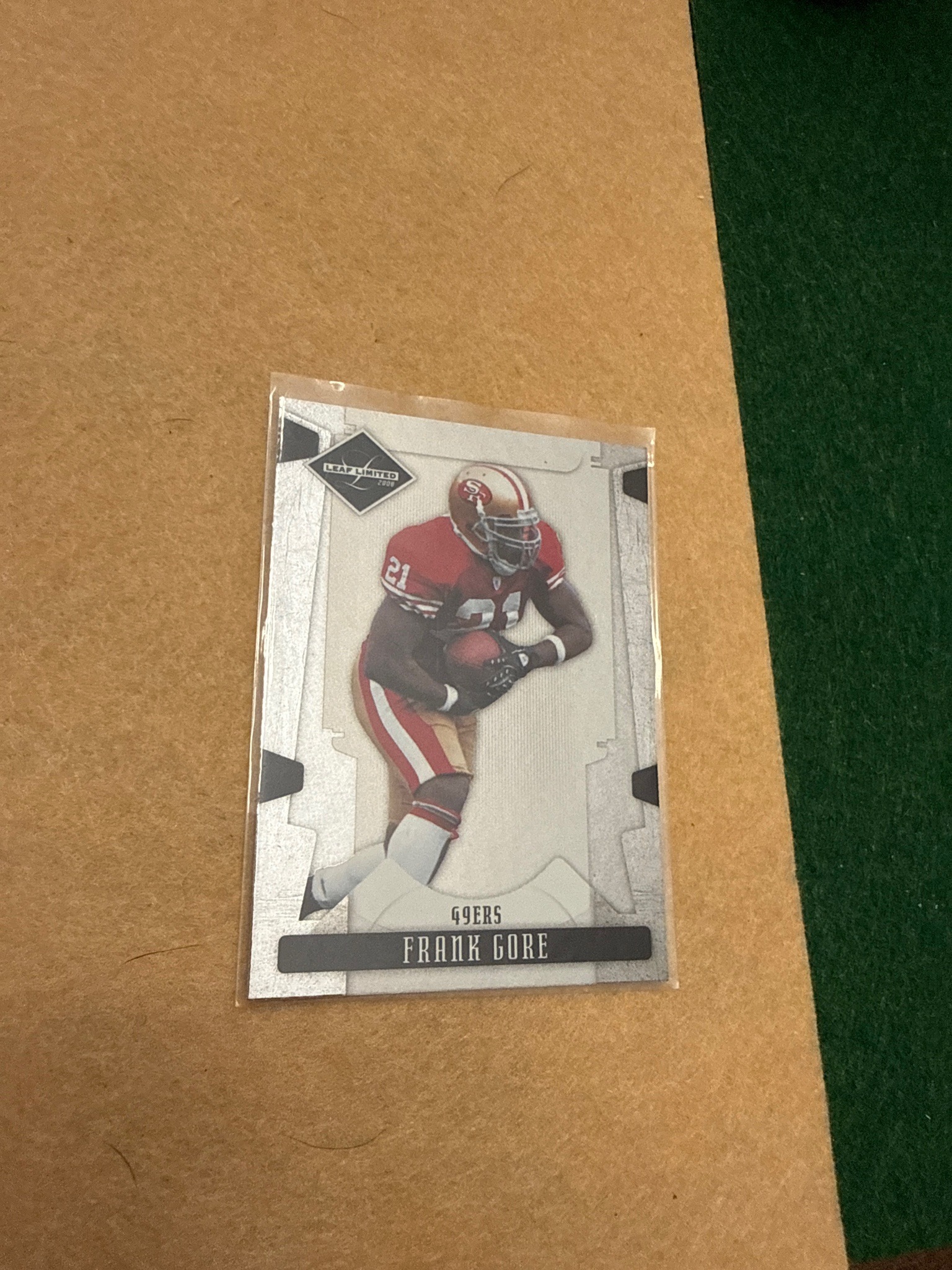 This is a 2008 Leaf Limited trading card featuring Frank Gore, the legendary running back for the San Francisco 49ers. The card displays a high-gloss finish with a textured, metallic silver-toned background frame that gives it a premium 'Limited' aesthetic characteristic of the Donruss/Playoff era. Gore is depicted in his classic red and gold 49ers home uniform, clutch-carrying a football in a dynamic action pose. The card design includes a black diamond logo in the upper left corner containing the 'Leaf Limited 2008' branding. At the bottom, a black horizontal bar features 'FRANK GORE' in white serif typography, with '49ERS' printed just above it. The card is standard 2.5 by 3.5 inches in size and appears to be housed in a clear protective polypropylene sleeve. Physically, the card shows sharp corners and clean edges, though there is a slight visible centering shift toward the right. The printing is vibrant with no discernible fading or surface scratches visible through the sleeve. As a product from 2008, it captures Gore during his prime years with the team, making it a desirable piece for franchise collectors and proponents of the NFL's all-time leading rushers.