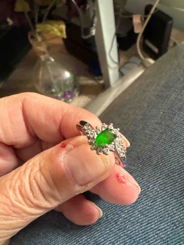 This is a contemporary styled bypass halo cocktail ring featuring a central oval-cut gemstone. The primary stone exhibits a vivid, saturated green color characteristic of a high-quality emerald or possibly a chrome diopside, meticulously secured in a multi-prong setting. Surrounding the center stone is a partial halo of small, round brilliant-cut colorless accent stones, likely diamonds or cubic zirconia, which continue along the curving shoulders of the bypass shank. The metal appears to be a polished white gold, platinum, or rhodium-plated sterling silver, showing a bright, reflective finish. The construction utilizes a bypass design where the two ends of the band overlap rather than meeting at a single point, creating a fluid, asymmetrical look. Based on the style, this piece likely dates from the late 20th century to the present. The craftsmanship shows precise stone setting with uniform prongs. Condition-wise, the ring appears to be in good estate condition with minor surface abrasions on the metal shank consistent with gentle wear. No visible chips are apparent on the gemstones from this angle, though internal inclusions typical of emeralds are visible, suggesting the stone is of natural origin. The overall design prioritizes light capture to enhance the sparkle of the accent stones against the deep green of the center focal point.